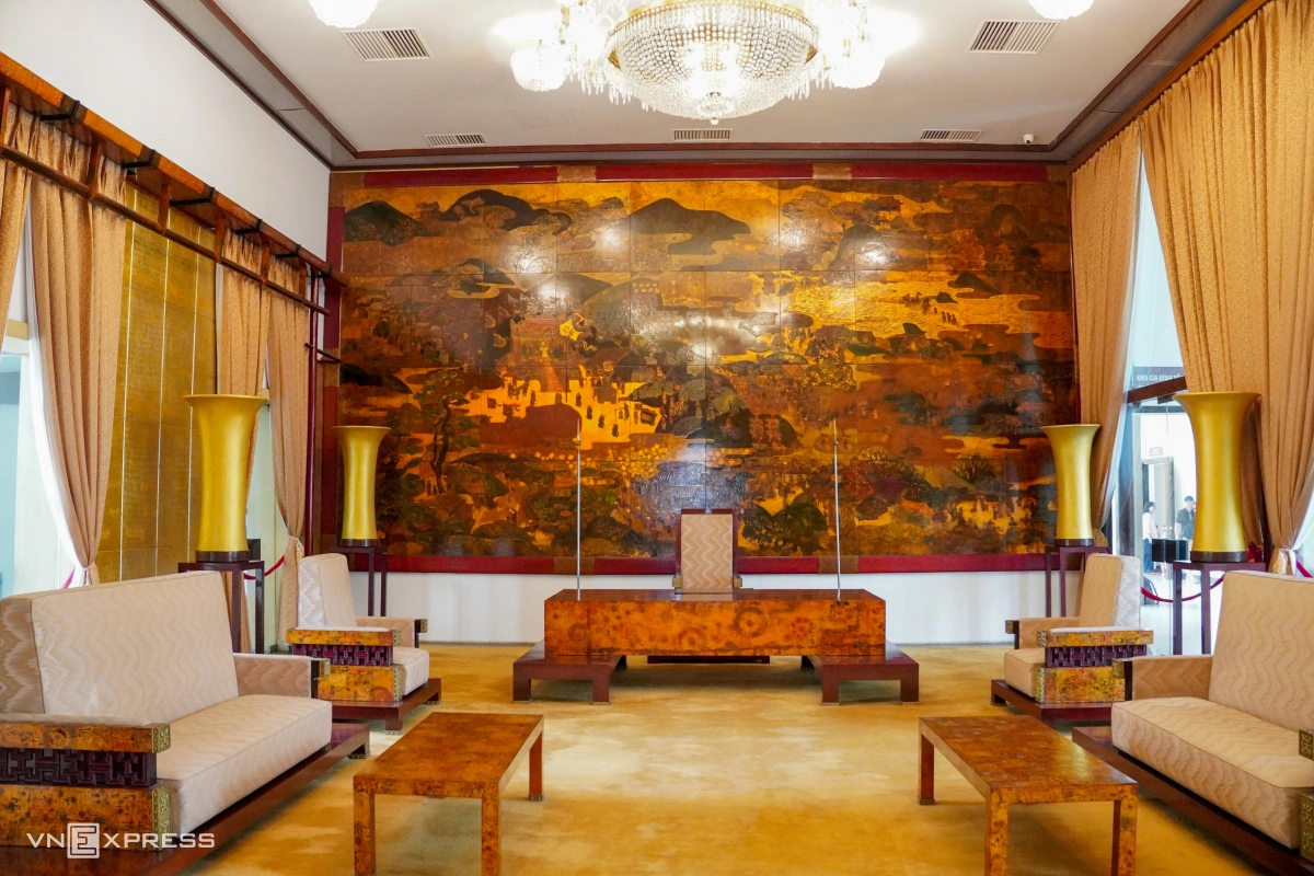 The room’s interior was designed by artist Nguyen Van Minh, primarily using Japanese-style lacquerware techniques. The highlight is the “Binh Ngo Dai Cao” painting consisting of 40 pieces, depicting the peaceful scene of the Vietnamese people in the 15th century, with King Le Loi announcing victory over the Ming army at the center. Eight symbolic torches line the walls, lit during important diplomatic ceremonies.